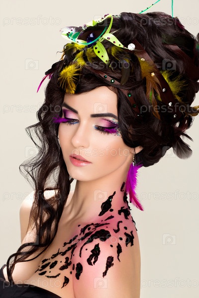 Футуристическая роскошная прическа. Яркий макияж и татуировки