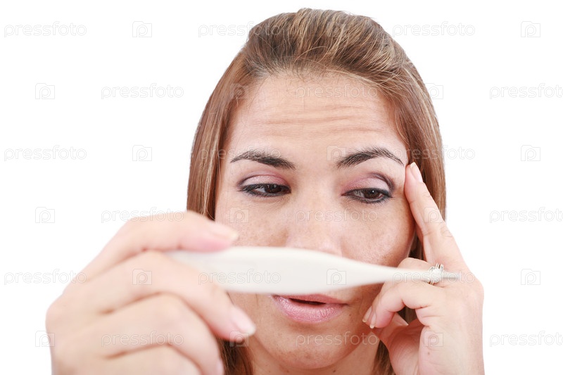 Больная женщина смотрит на термометр