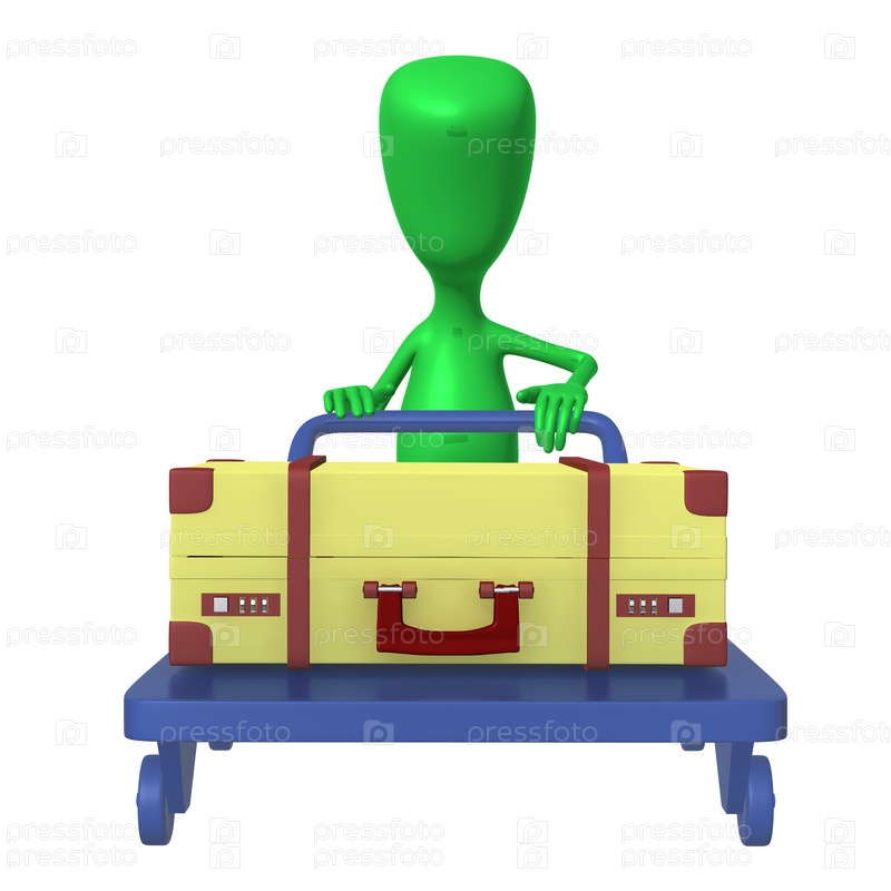 Зеленый человечек везет тележку с чемоданом