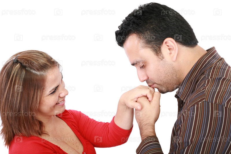 Муж целует руку улыбающейся жены