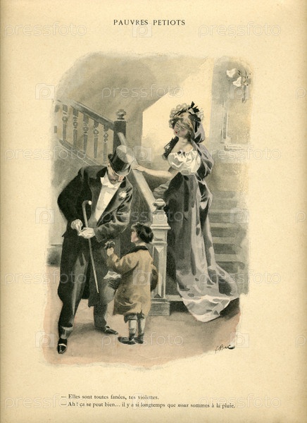 Иллюстрация из книги 'La Femme intime' (1894 год).Женщина на лестнице, мужчина подает милостыню мальчику