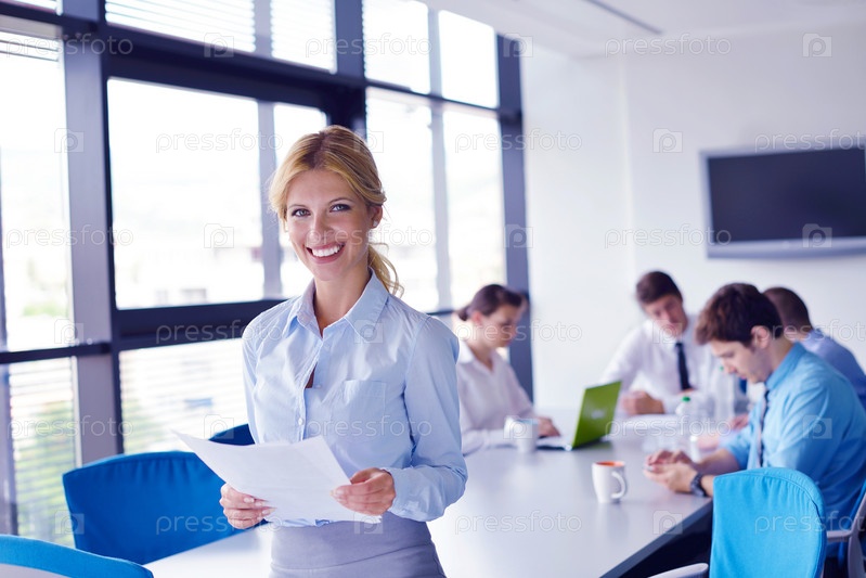 Бизнес-леди с ее сотрудниками на заднем плане в офисе