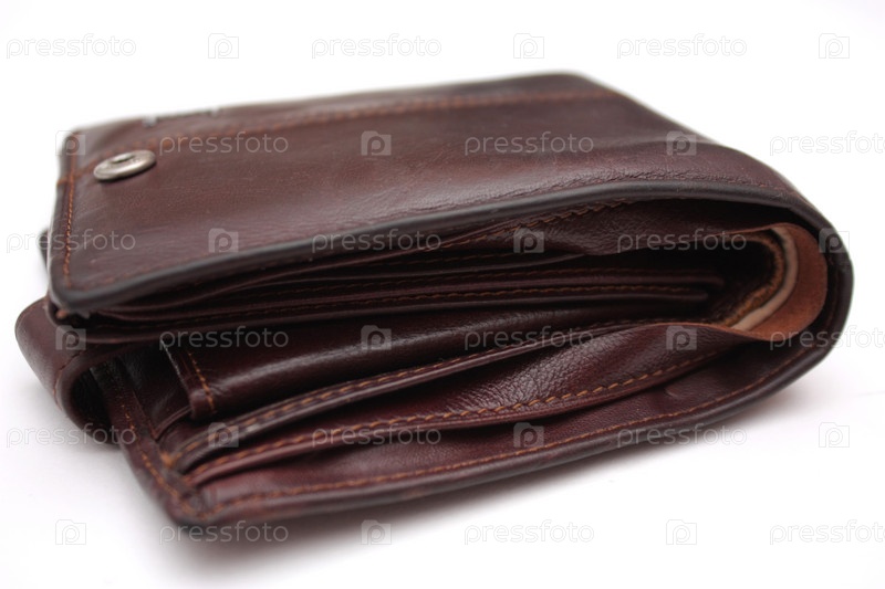 Пустой коричневый кожаный кошелек на белом фоне