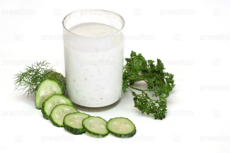 Кефир с огурцом, петрушкой и укропом, изолированные на белом фоне