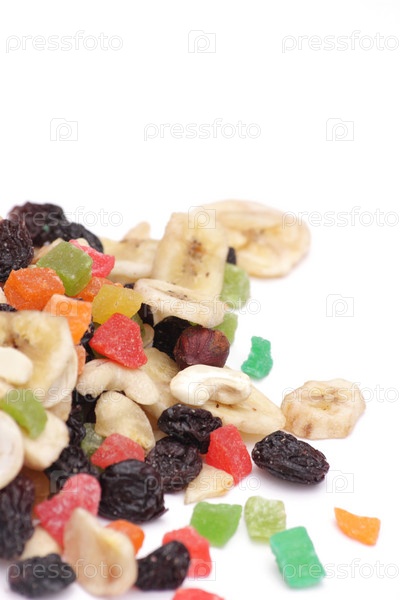 Банановые чипсы, фундук, миндаль, изюм, кешью и засахаренные фрукты с пространством для текста