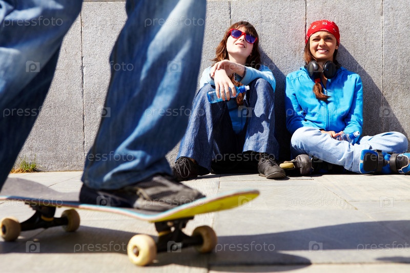 Нога на скейтборде и две девушки, сидящие у стены на втором плане