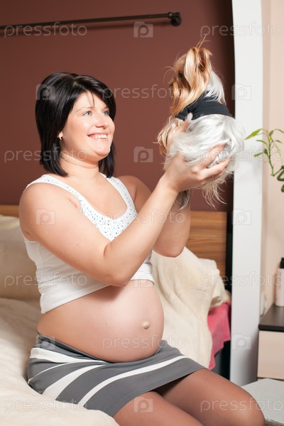 Беременная женщина сидит на кровати и держит в руках маленькую собачку
