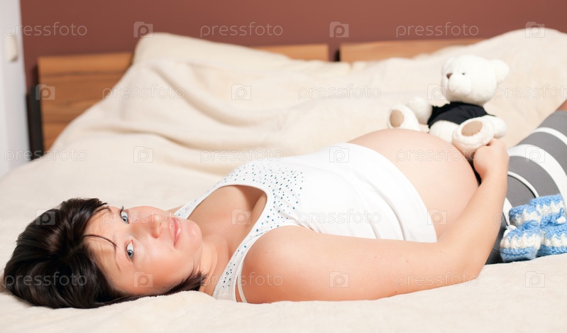 Беременная женщина на кровати с плюшевым мишкой