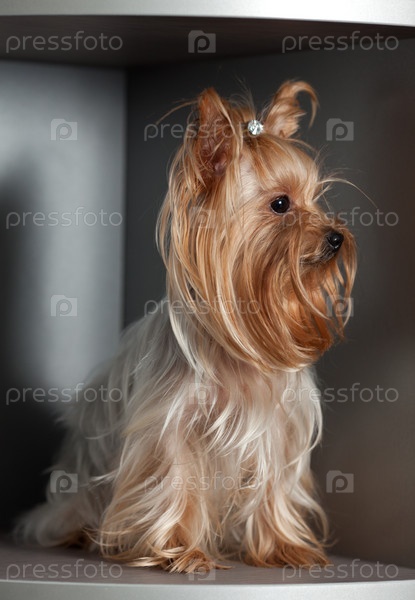 красивый йоркширский терьер сидит на полку