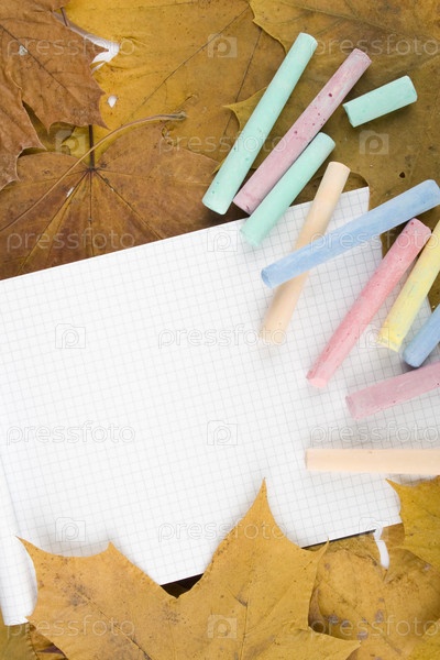 Тетрадь и мелки на осенних листьях