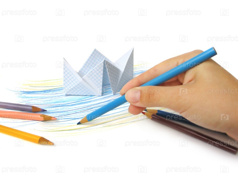 Бумажный кораблик в нарисованном карандашами море