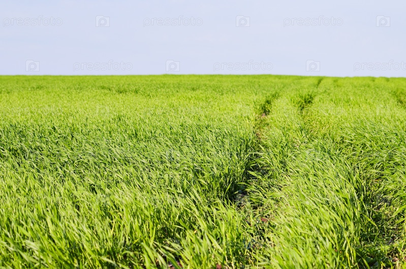 Поле зеленой травы под голубым небом