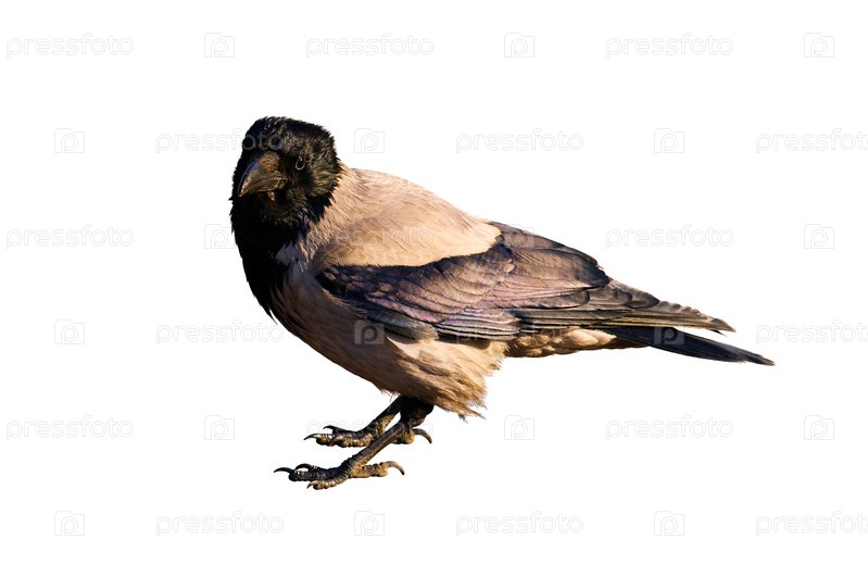 Серая ворона смотрит в камеру на белом фоне