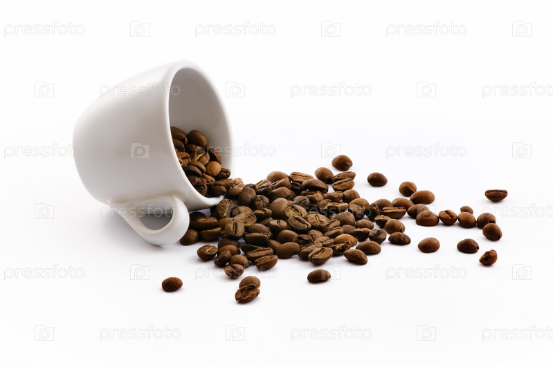 Белая чашка с кофе в зернах, изолировано на белом фоне