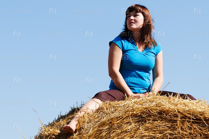 Девочка сидит на стоге сена