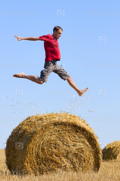 Человек прыгает через стог сена