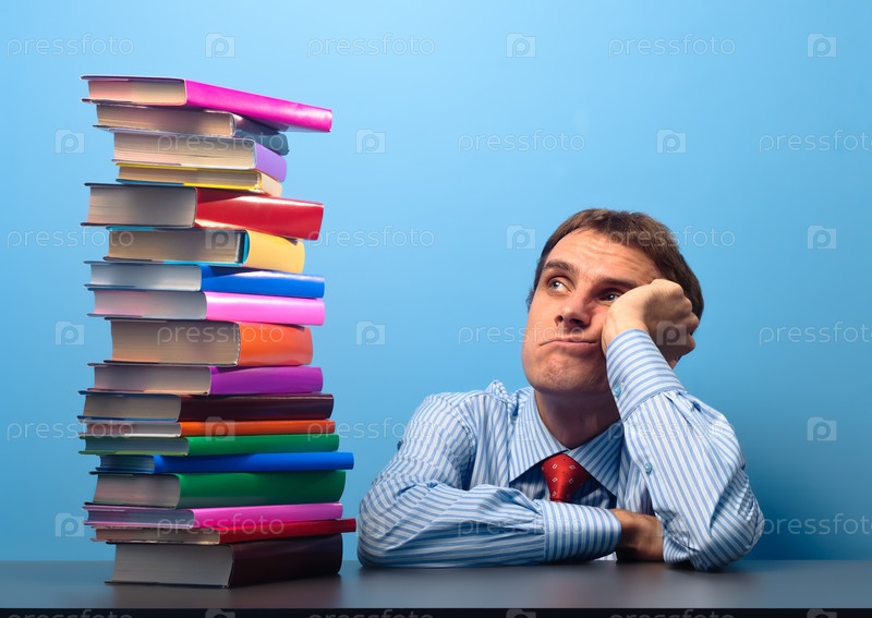 Мужчина сидит за столом со стопкой цветных книг