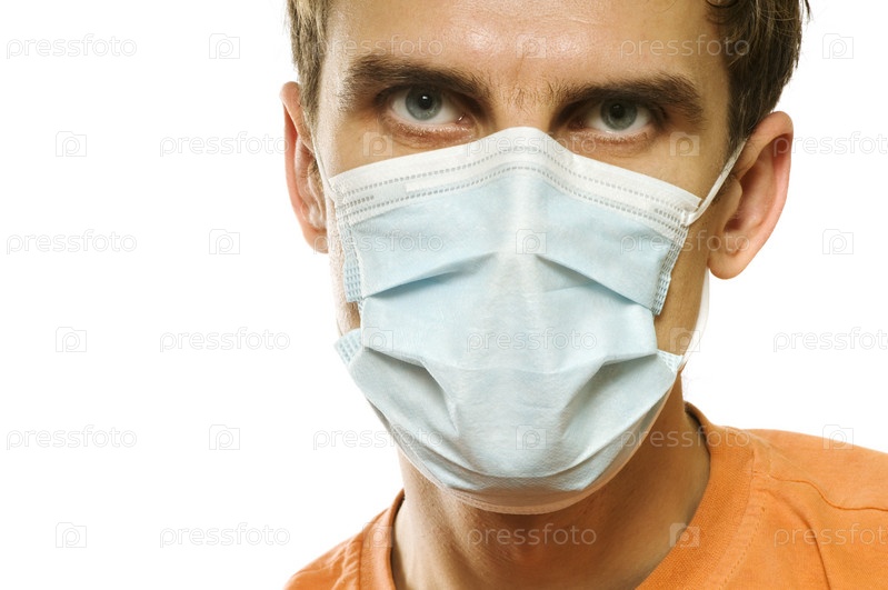 Мужчина в защитной медицинской маске на белом фоне
