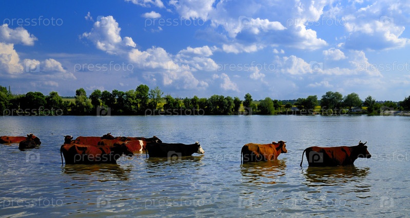 Стадо коров на фоне воды