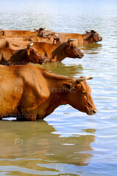 Стадо коров на фоне воды