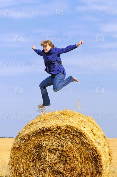 Девушка прыгает через копну сена