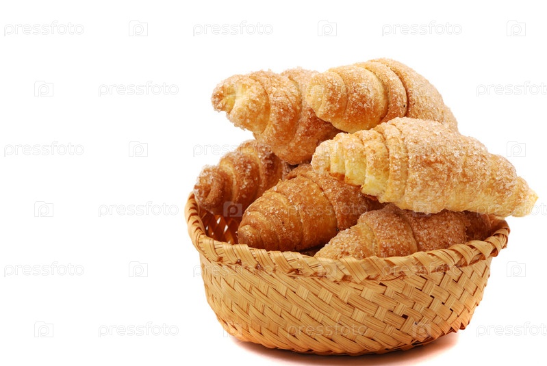 Свежие круассаны в корзинке на белом фоне