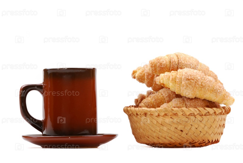 Свежие круассаны в корзинке и чашка чая на белом фоне