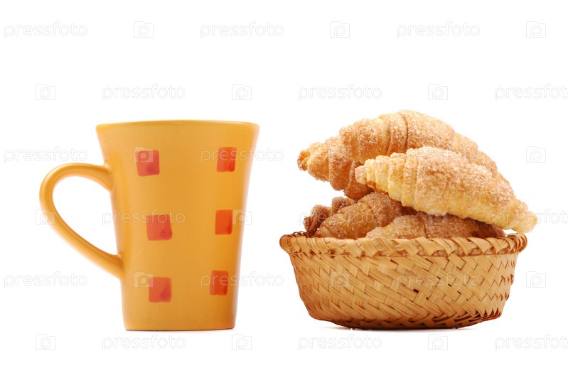 Свежие круассаны в корзинке и чашка чая на белом фоне