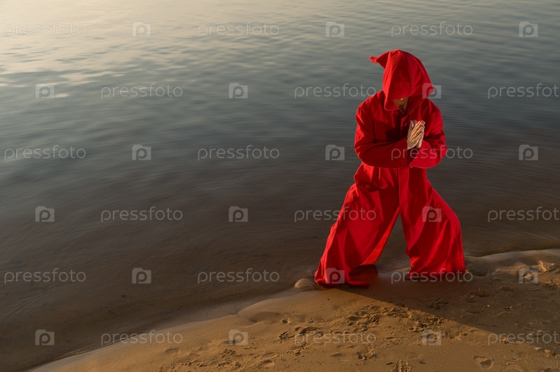 Монах в красном колпаке занимается карате или медитирует
