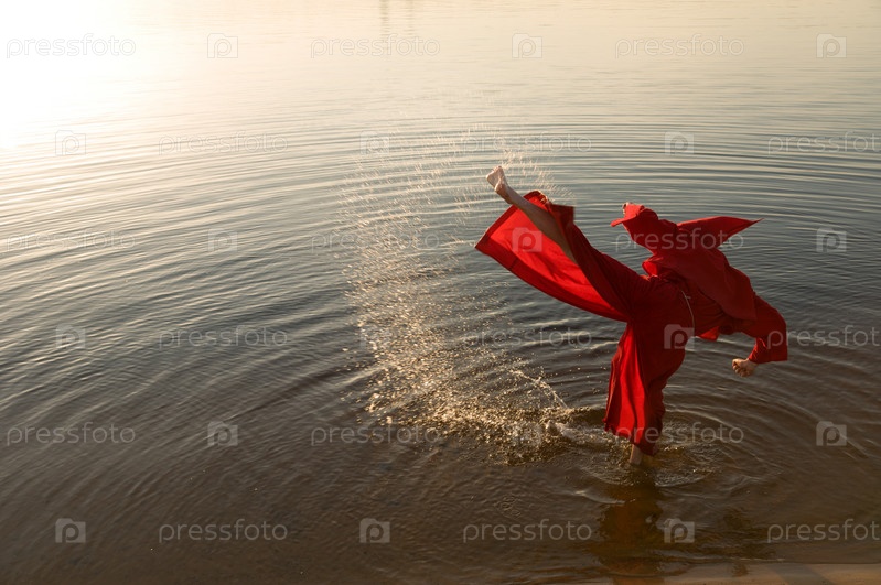 Монах в красном колпаке занимается карате