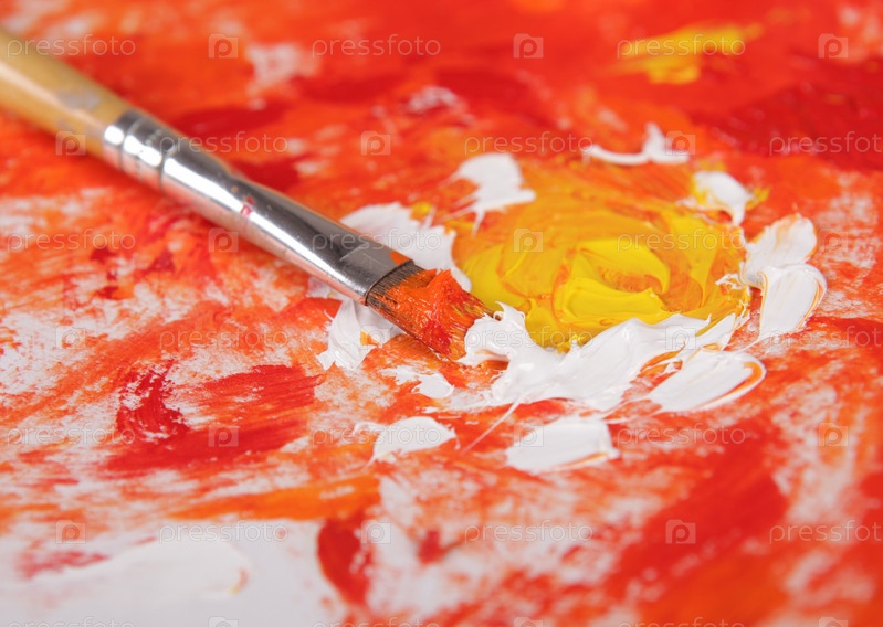 Кисть с краской на поверхности картины с желтым цветком на красно-оранжевом фоне