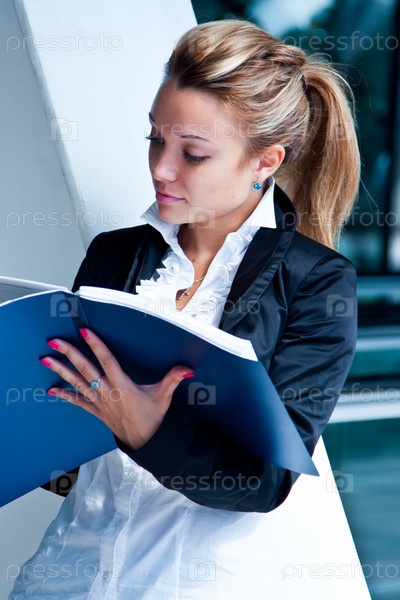 Молодая и красивая деловая женщина изучает документы в синей папке