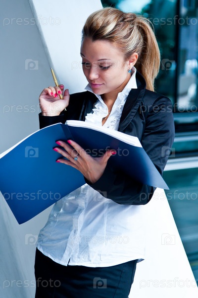 Молодая и красивая деловая женщина изучает документы в синей папке