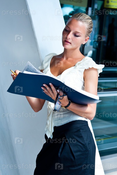 Молодая красивая деловая женщина изучает документы в синей папке