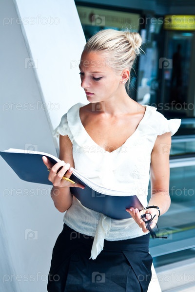 Молодая красивая деловая женщина изучает документы в синей папке