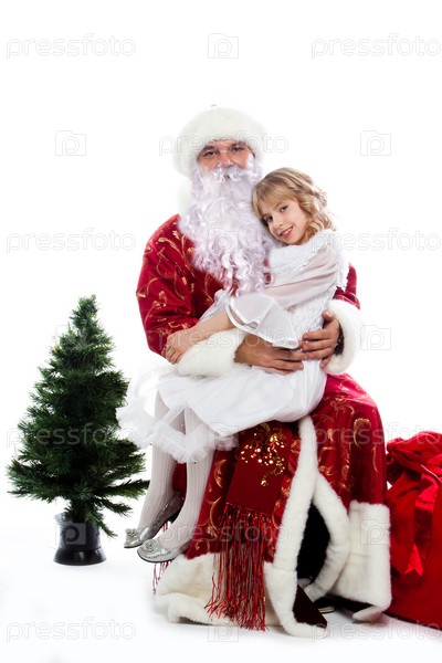 Дед Мороз дарит подарки маленькой хорошенькой девочке