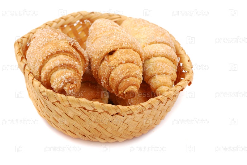 Аппетитные круассаны в корзинке на белом фоне