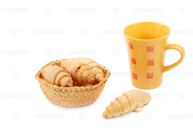 Аппетитные круассаны и чашка чая на белом фоне
