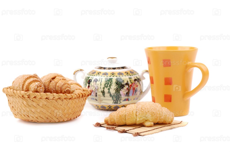 Аппетитные круассаны, чайник и кружка на белом фоне