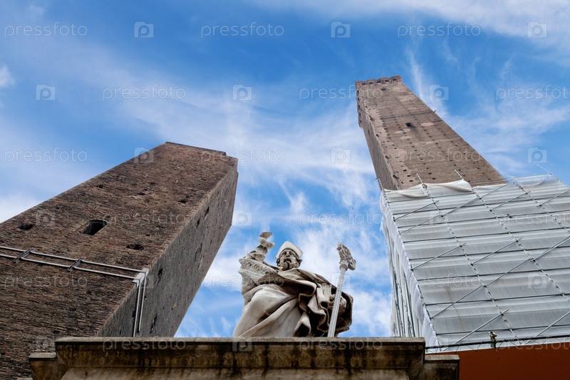 Башни и статуя под голубым небом в Болонье