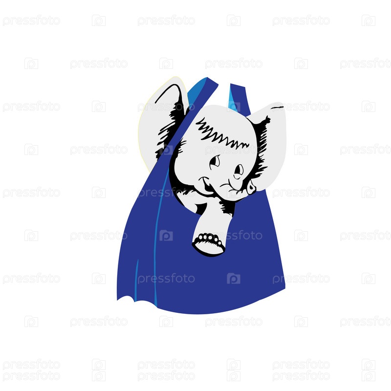 Слоненок в синем мешке на белом фоне