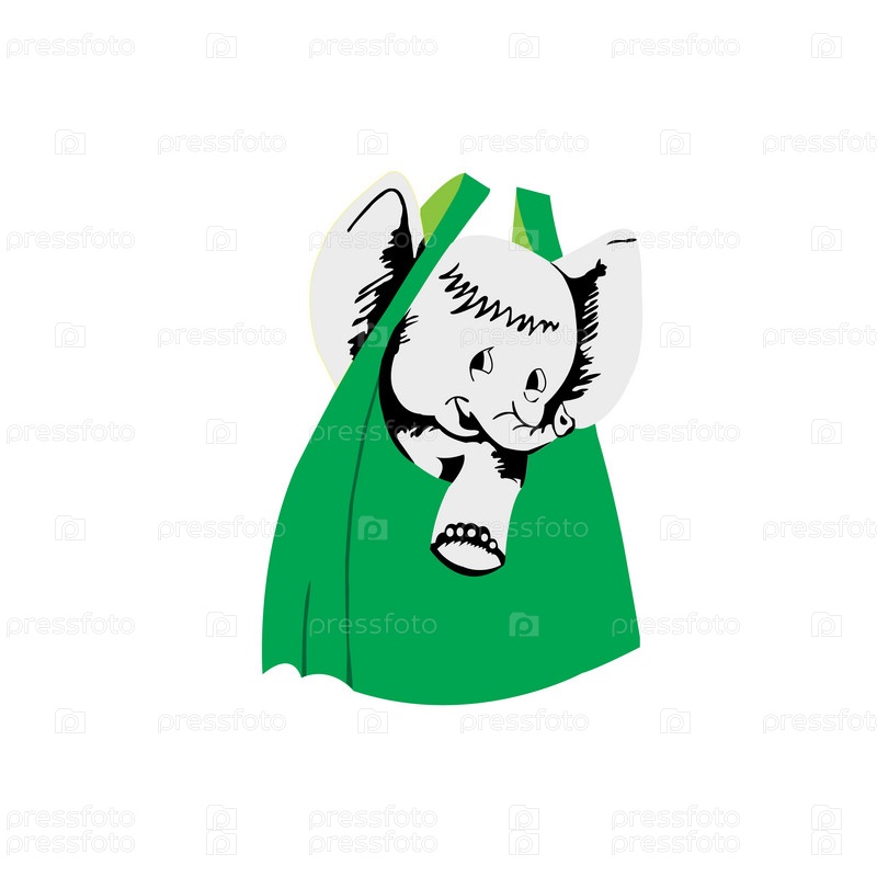 Слоненок в зеленом мешке на белом фоне