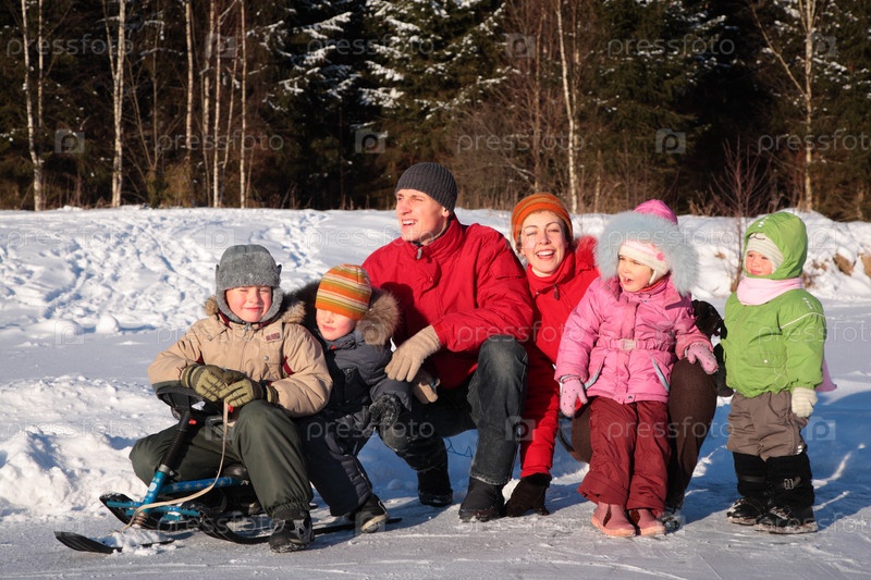 Семья с четырьмя детьми в лесу зимой