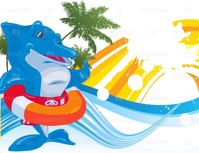 Дельфин - спасатель на фоне волн и пальм