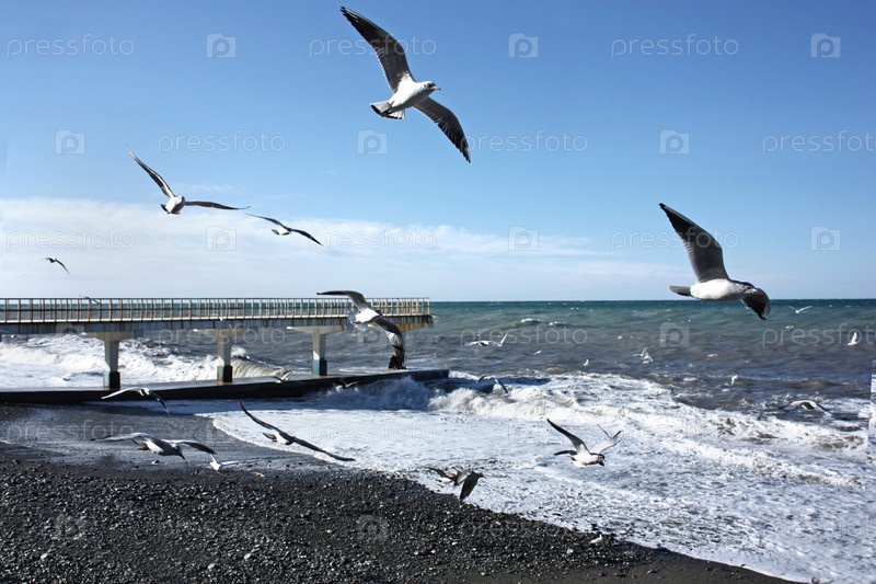 Летящие чайки у пенного берега моря