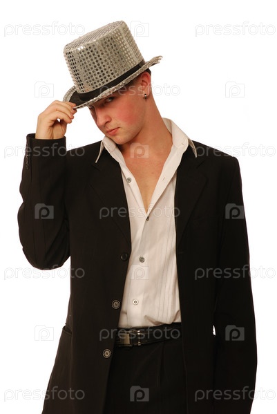 Молодой мужчина в блестящей шляпе на белом фоне