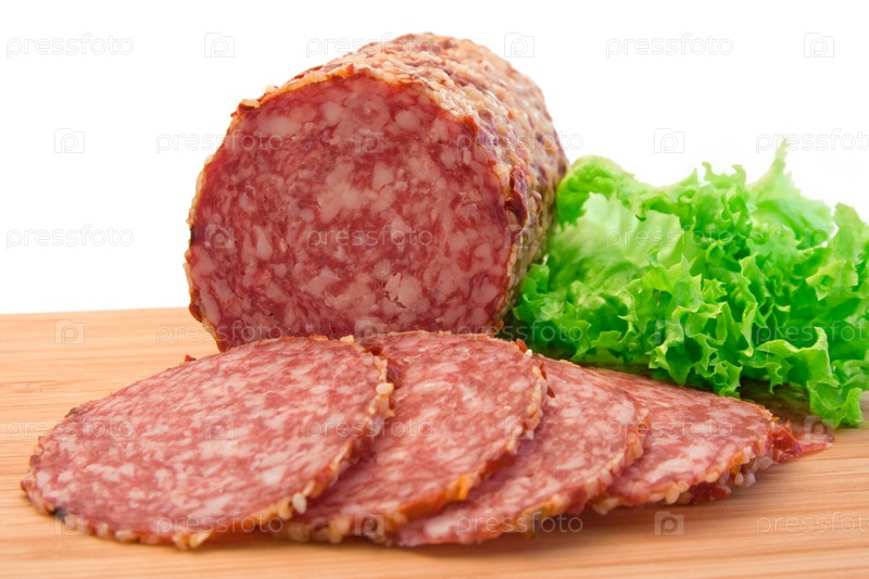 Копченая колбаса на белом фоне