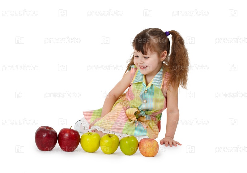 Маленькая девочка сидит на белом фоне с яблоками