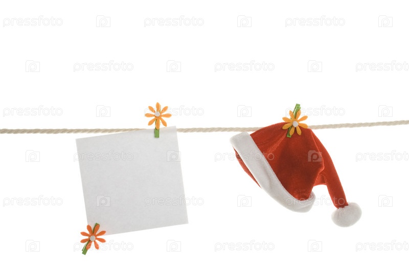Листы бумаги и колпак Санта Клауса на прищепках на белом фоне