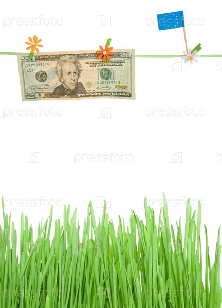 Американский доллар и флажок Евросоюза на веревке над травой